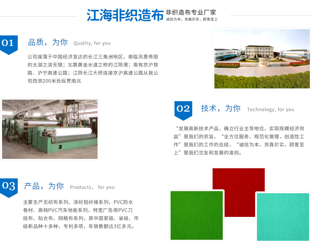 江海企業(yè)有江陰市江海非織造有限公司、江陰市江海防水材料有限公司、江陰市三江寬幅無(wú)紡布有限公司、江陰市三江織物涂層新材料有限公司組成,均屬于江蘇省民營(yíng)科技企業(yè)。企業(yè)現(xiàn)擁有員工近千名,占地15萬(wàn)平方米,廠房建筑面積達(dá)80000多平方米,凈資產(chǎn)超億元,主要生產(chǎn)無(wú)紡布系列、滌綸短纖維系列、PVC防水卷材、高檔PVC汽車(chē)地板系列、特寬廣告用PVC刀括布、貼合布、網(wǎng)格布系列,其中國(guó)家級(jí)、省級(jí)、市級(jí)新產(chǎn)品十多種,專利多項(xiàng),年銷(xiāo)售額達(dá)3億多元。